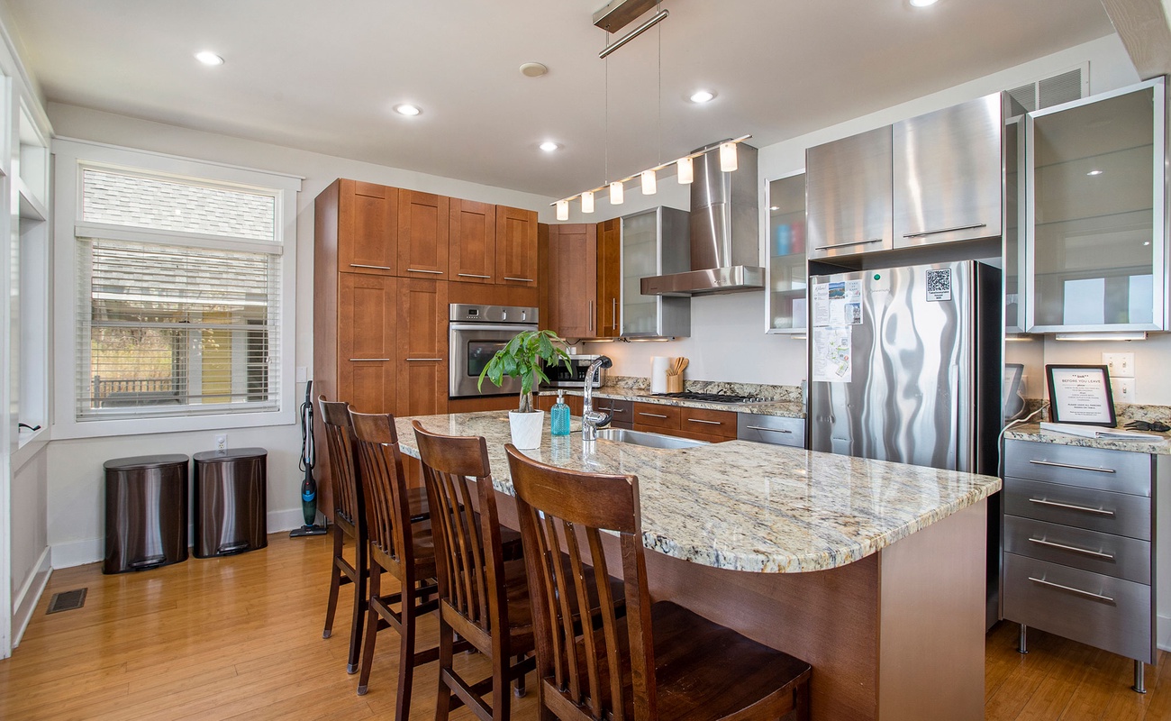 The fully stocked kitchen is designed for group cooking and easy meals together.