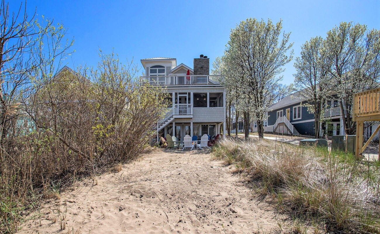 Just steps from the home, you’ll find kayak and paddleboard rentals on Lake Kai, complimentary with your Beachwalk wristbands, along with newly added bocce ball and shuffleboard courts. Stroll the boardwalk to the Beachwalk clubhouse, which features indoor and outdoor seating, a pool table, ping pong table, observation deck, and the community restaurant, The Beach Hut. Continue along the white boardwalk to reach Lake Michigan’s beach, making it easy to enjoy both lakes during your stay.