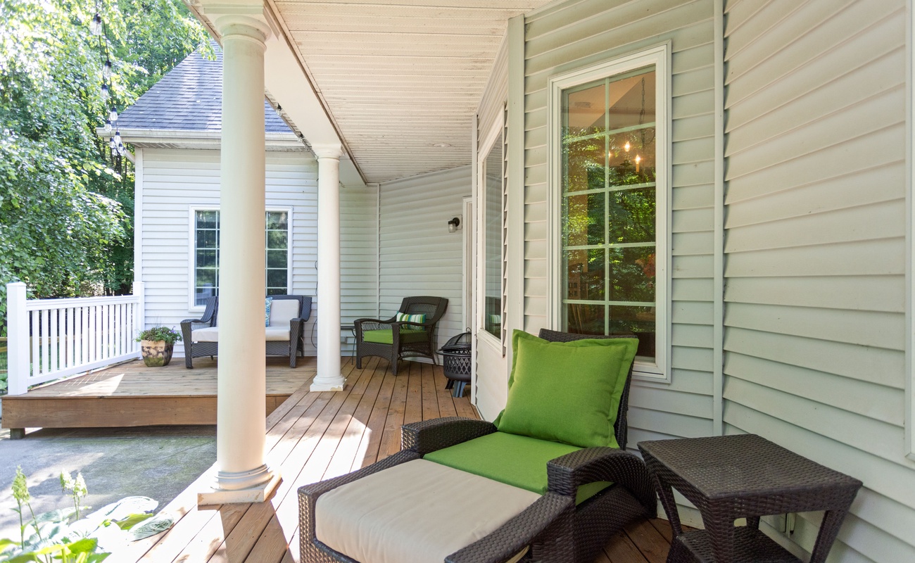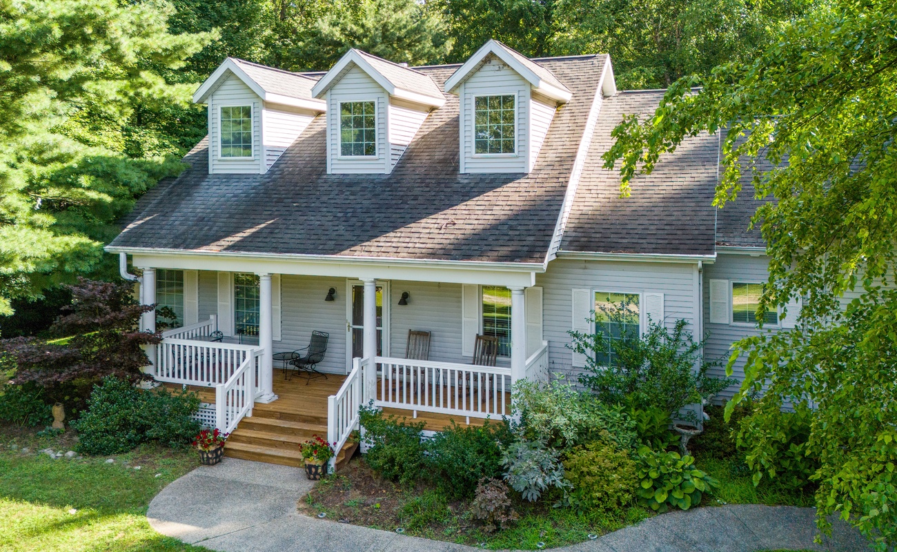 The home is set back from the road with a spacious front porch boasting breathtaking country views of a nearby stable, ideal for sipping morning coffee in the morning or for enjoying a glass of wine as the sun sets.