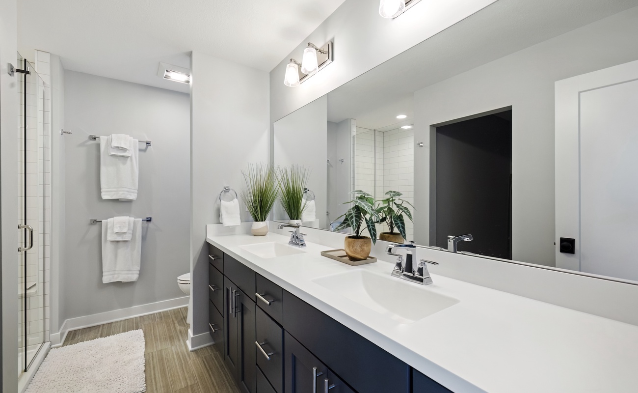 Ensuite bath with double sinks and a sleek tiled shower