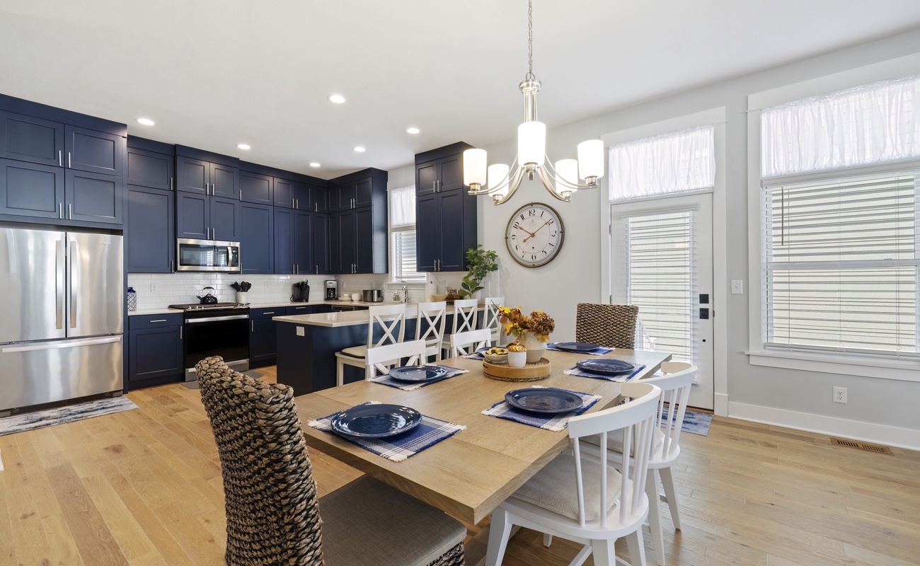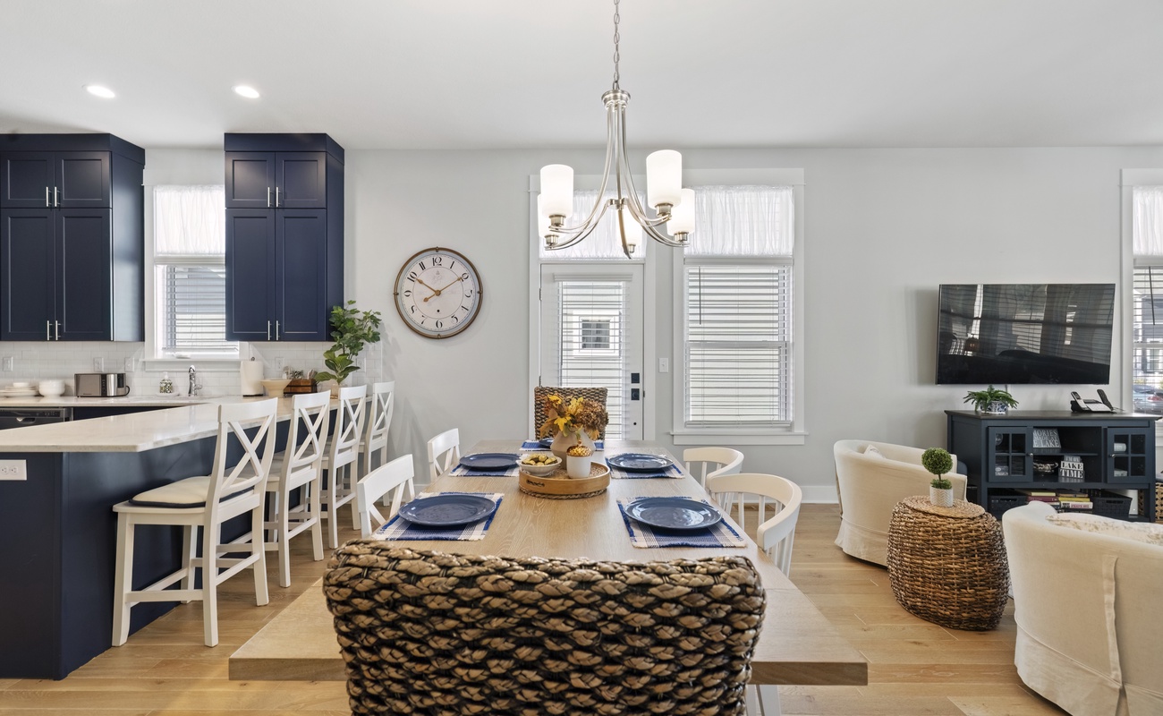 A spacious dining table just steps from the kitchen for meals or board games