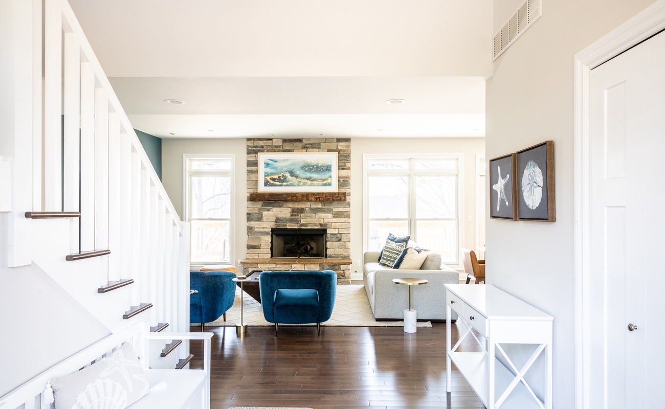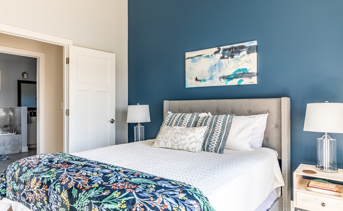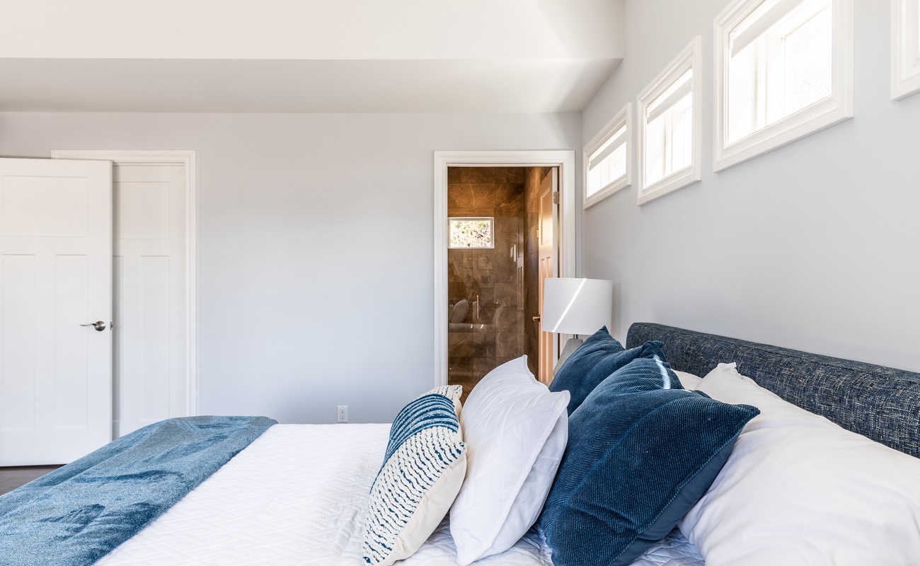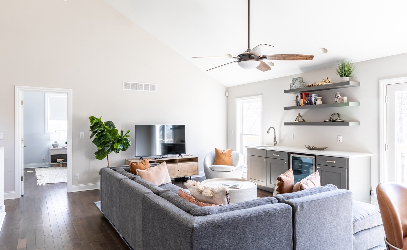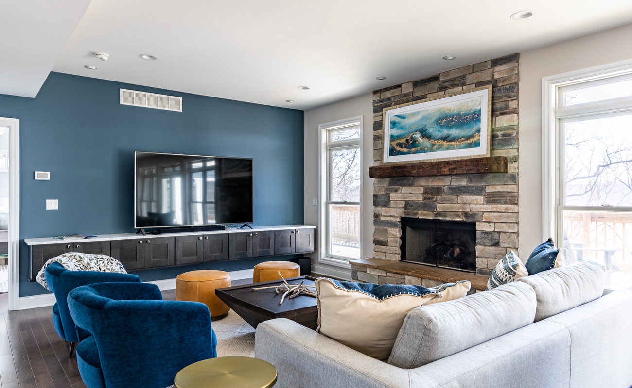 When you head upstairs you’ll find a professionally decorated secondary living space with a sectional, TV, bar top, wine fridge, and high top table. To the left of the stairs is a second master suite with a full bathroom and walk in shower.