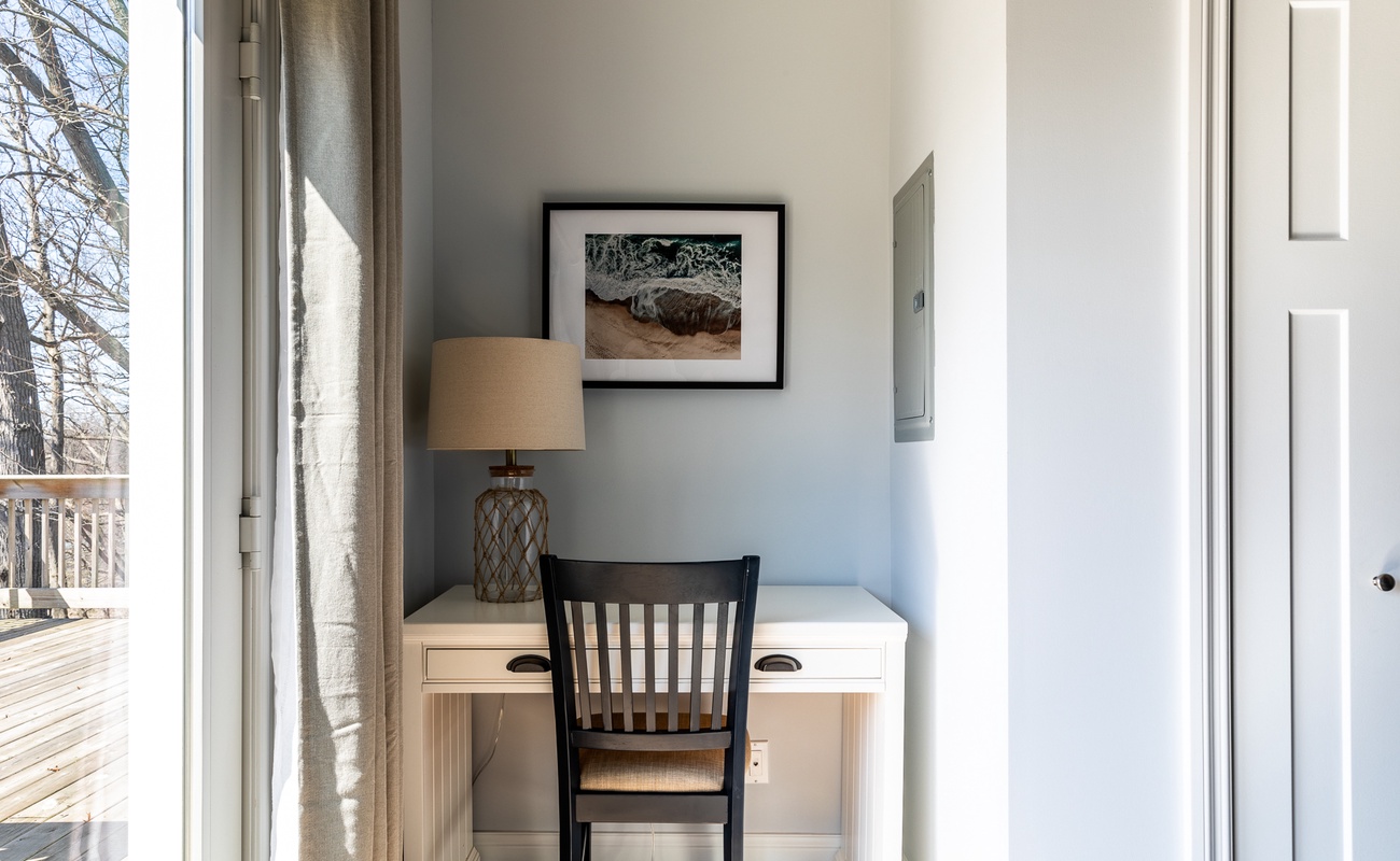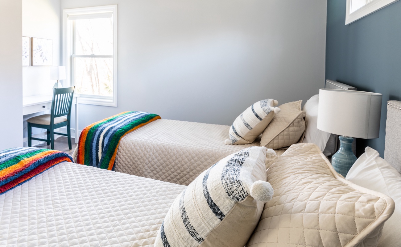 Continuing down the hall are 3 more bedrooms and a large main bathroom with soaker tub that services the upstairs guests. Two of the bedrooms feature Queen beds and one features 2 twin beds with a desk.
